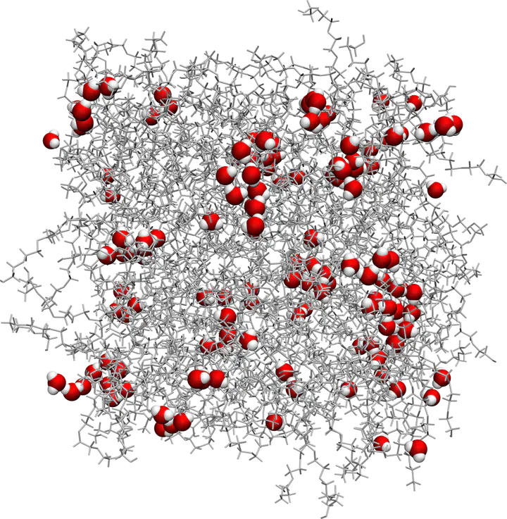 Molecular dynamics simulation showing water molecules (in red and white) adsorbed within a polymer with molecular-sized pores (in gray). These simulations are used to study the collective transport properties of the molecules, and the results can be compared with those obtained from neutron scattering experiments